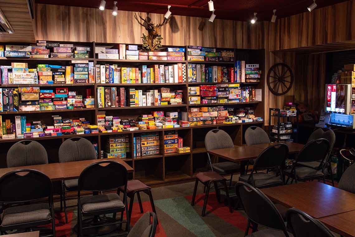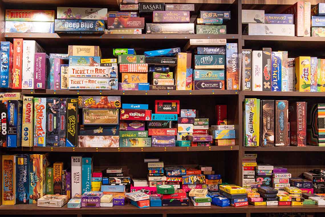 壁一面はボードゲームや交流ゲーム置き場に。いつでも自由に遊ぶことができ、店員さんに説明もしてもらえます。